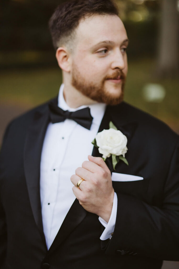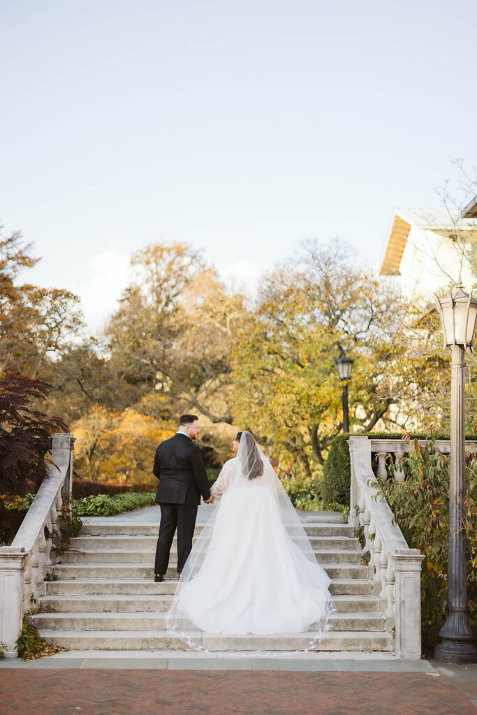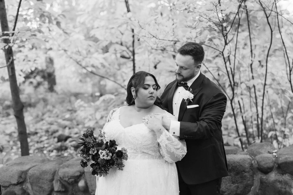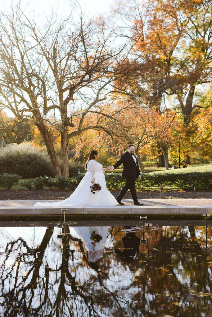 With an evening ceremony ahead, Dahlia + Joshua were very intentional about making the most of the afternoon daylight. When everyone arrived, we moved right into the set up for Dahlia + Joshua’s first look by the Lily Pool where capturing their reflection in the water was high on Dahlia’s must-have photo list. From there, we moved right into bride and groom portraits around the grounds capturing all of the vibrant fall colors and ticking off the rest of their special photo requests.