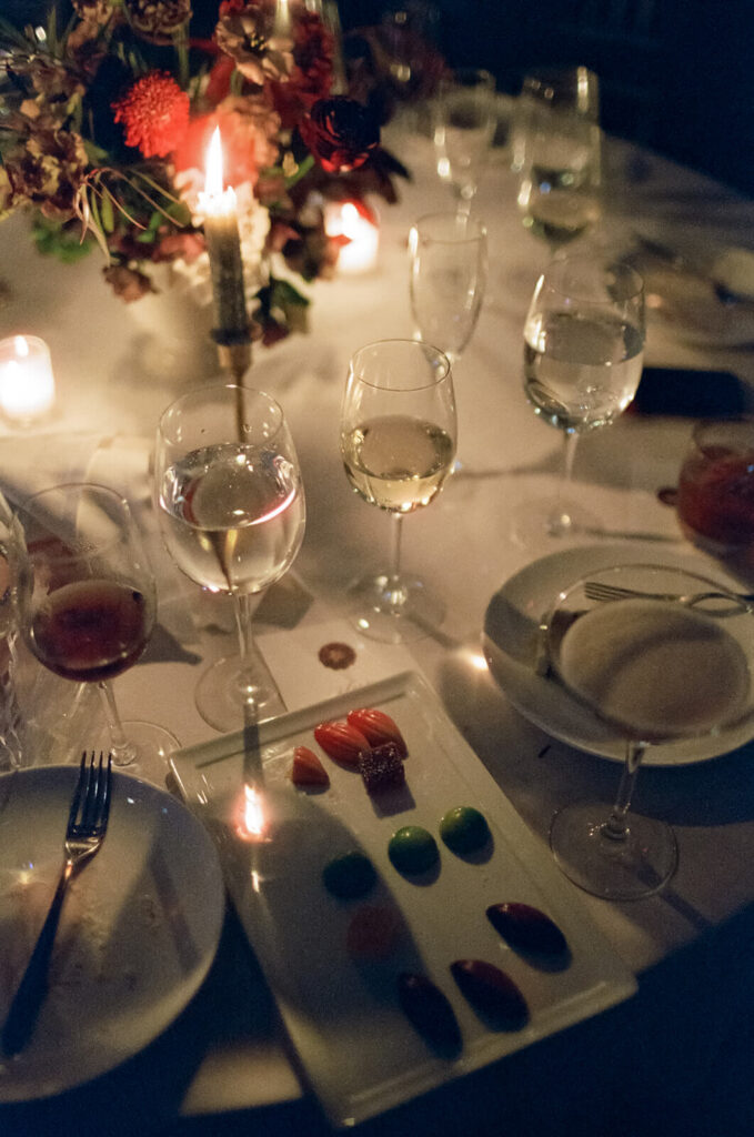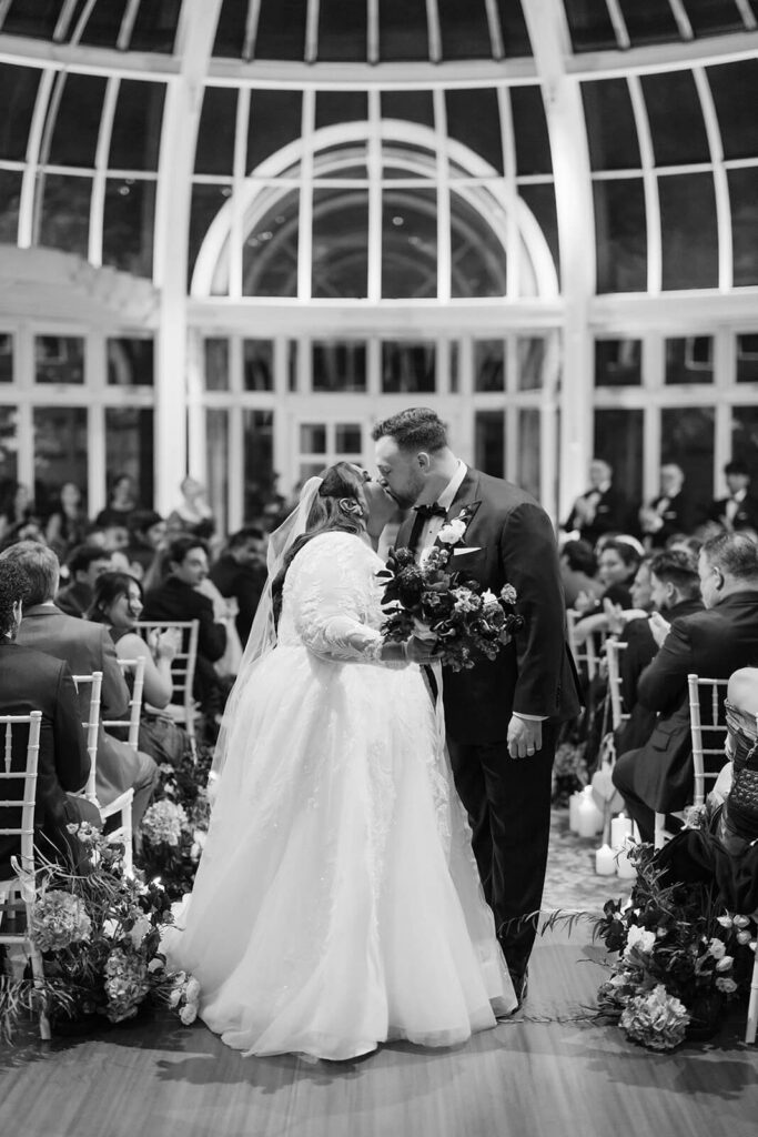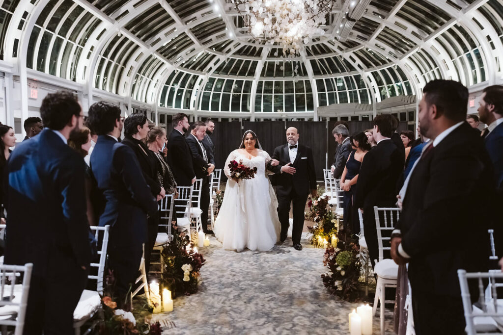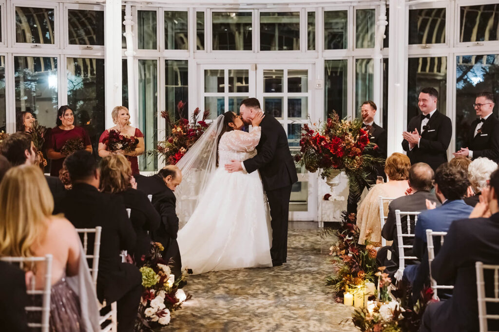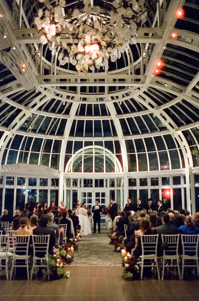 As evening fell, guests began to fill the Palm House. The ceremony space was set up with elegant white chairs lined up beneath the glass dome of the space giving a clear view of the deep blue sky above. Pops of deep wine-colored flowers interspersed with flickering candles lined the aisle leading up to the area where Dahlia + Joshua would renew their vows.