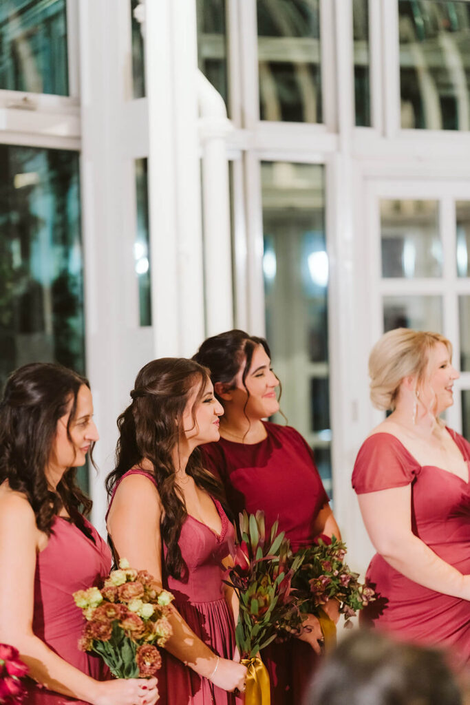 Dahlia spent the morning getting ready at one of her bridesmaids’ Brooklyn apartment. The ladies got their hair and make up done and slipped into their dresses for the big day. Dressed in gorgeous shades of deep mulberry, the ladies gathered in the living room for a special bridesmaid first look before leaving to meet Joshua and the rest of the wedding party at the Brooklyn Botanic Garden.
