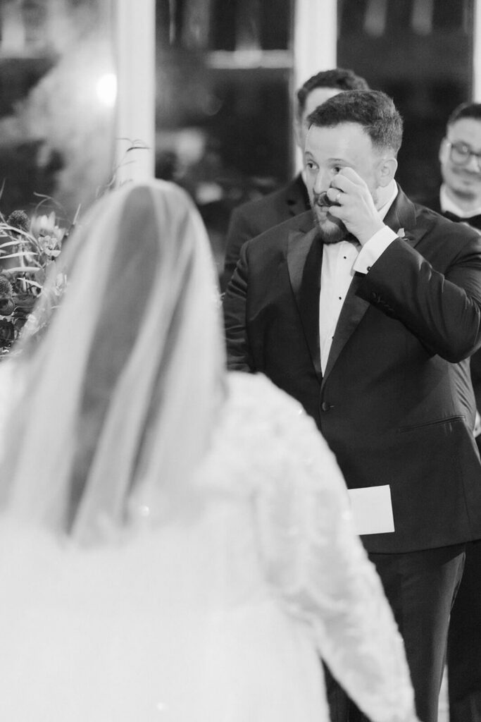 When the music began to play, Joshua appeared alongside his mom, guiding her gently down the aisle. They were closely followed by the wedding party and as the bridesmaids and groomsmen took their places, the music swelled and an excited hush fell over the guests. Dahlia appeared with her father and the emotion in the room shifted instantly as she made her way down to where Joshua stood.