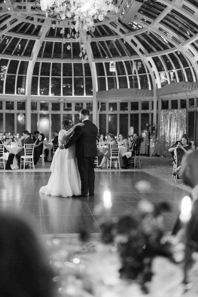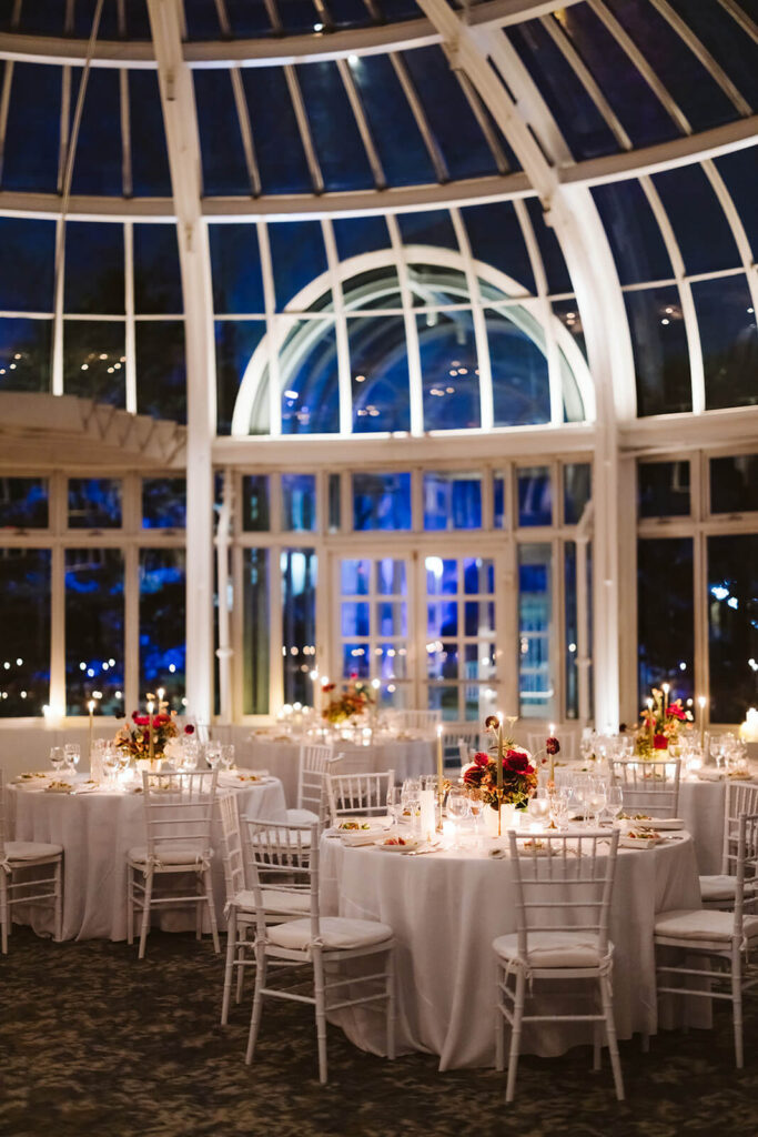 Before guests returned, I stepped into the Palm House to photograph the reception setup and all the details Dahlia + Joshua had put so much thought into. Capturing those elements was important to them and having that quiet window of time made it easy to document everything without interruption. With glass walls and ceilings surrounding the space, the panoramic views of the gardens and evening sky above, all together it created a stunning backdrop that elevated every intricate table and floral detail.