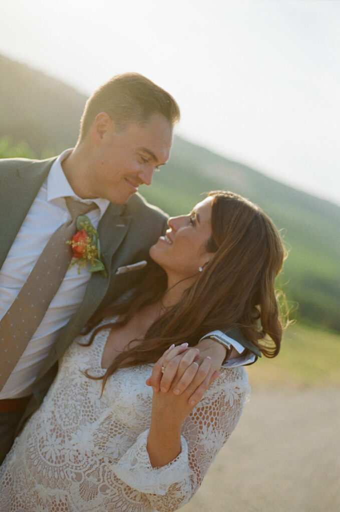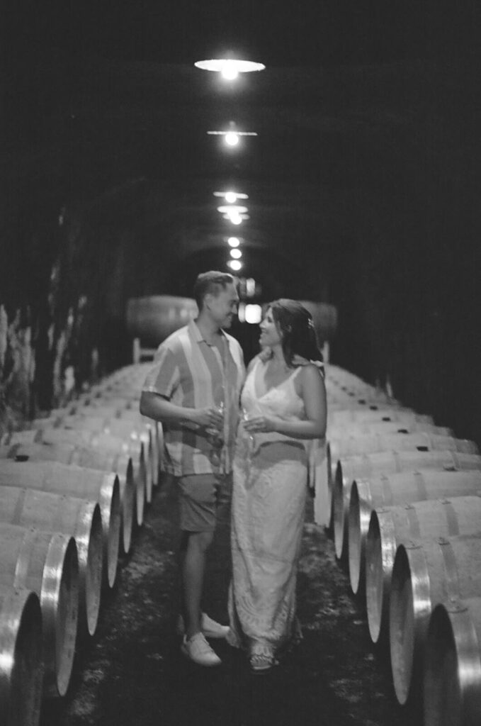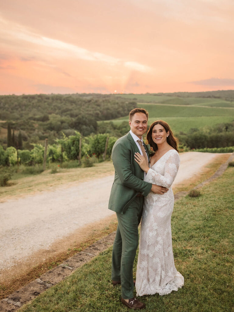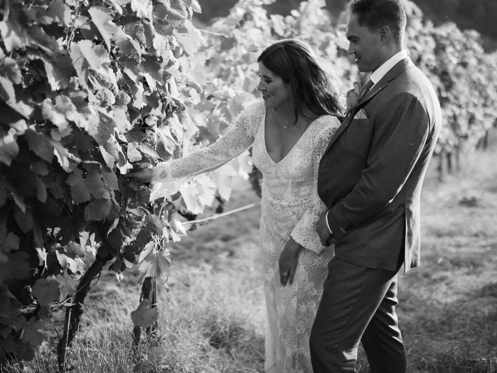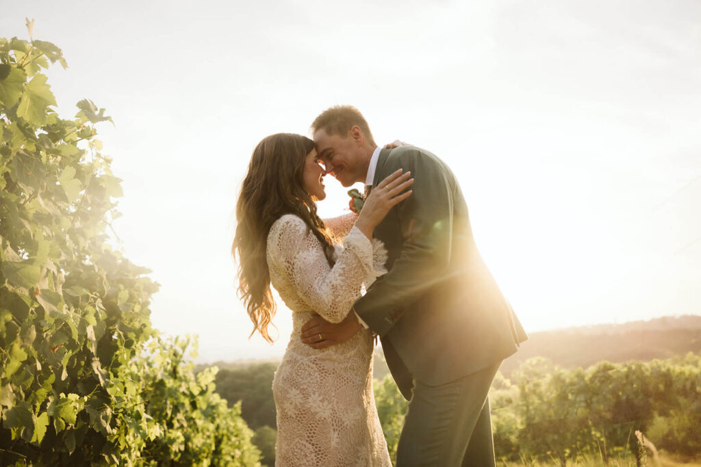 With the sun beginning to set, Gina + Alex slipped away from the dinner to take newlywed golden hour newlywed shots. The soft light of the setting sun illuminated them as they walked along the vineyard paths and through the rows of grapevines. And as the sun finally began to dip below the horizon, it drenched the sky in beautiful shades of pale pink and orange, making Gina + Alex look like they had just stepped into a painting.