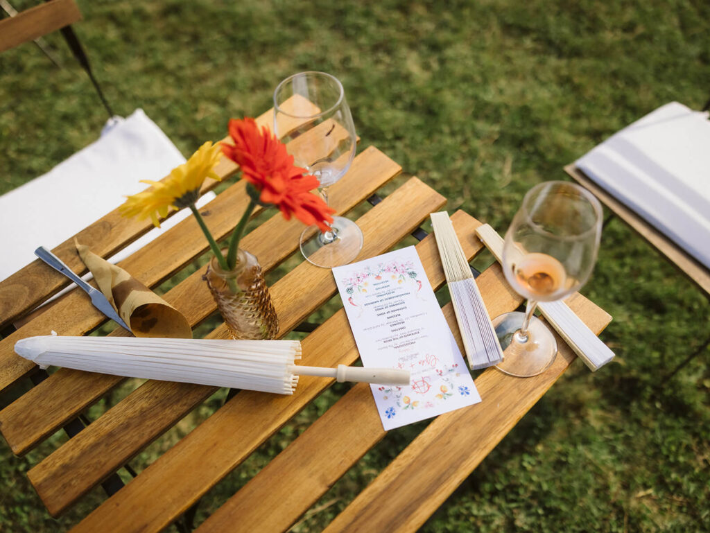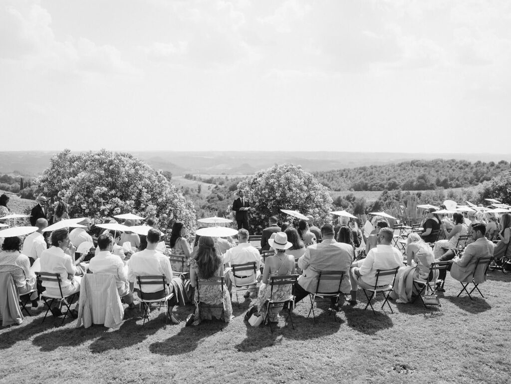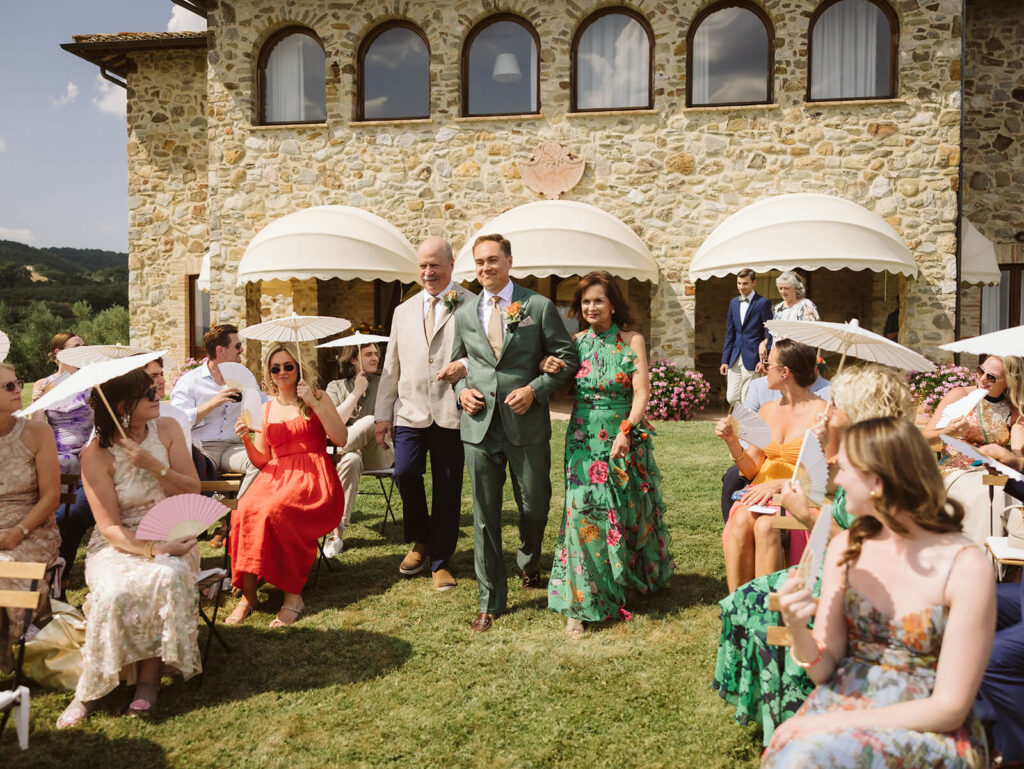 As the ceremony time approached, guests began arriving at the vineyard, filling in the seats arranged in a semicircle on the lawn of the Villa Barbi. The seats faced a panoramic view overlooking the rows of grapevines stretched across the rolling hills below, creating a beautiful background for Gina + Alex’s ceremony. With no trees to provide shade, parasols and fans were passed around to offer a little bit of relief from the warm June sun.