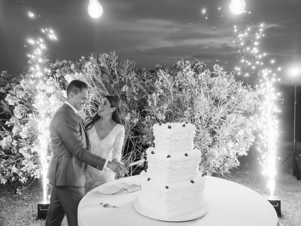 The two returned to the celebration just in time for dessert to be served. They cut their wedding cake amidst showers of fireworks sparkling on either side of them before sharing their first dance together and their parent dances. Finally, the celebration came to a peak as everyone filtered into the event hall. Music and colorful lights filled the space and Gina + Alex spent the rest of the night surrounded by all of the people they loved the most and dancing the night away.