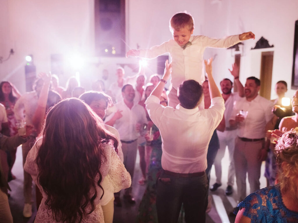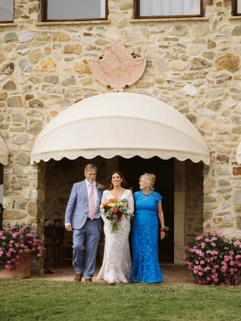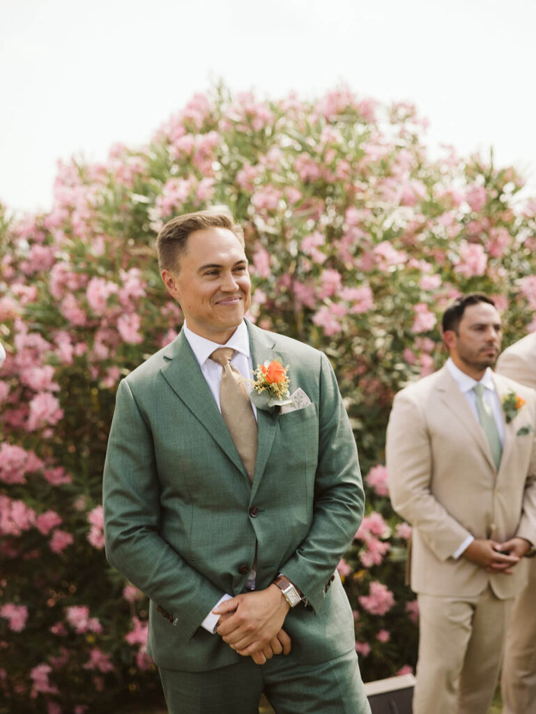 As the music changed to a soft, enchanting melody, Alex made his way down the aisle with his parents on each arm. The rest of the wedding party followed closely after and got into position along each side of the ceremony space. Then, with a swell of music, Gina appeared in the villa doorway with her parents by her side. Since the two of them had decided not to have a first look, this was the first time Alex saw her all day. His reaction said it all. A wide smile instantly lit across his face at the sight of his beautiful bride-to-be making her way down the aisle towards him.