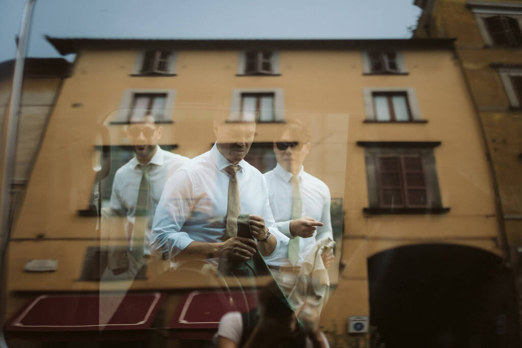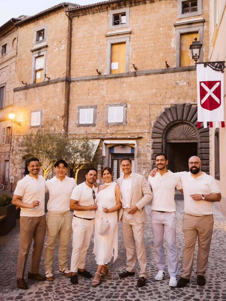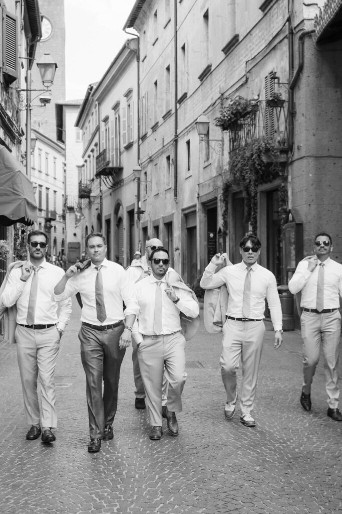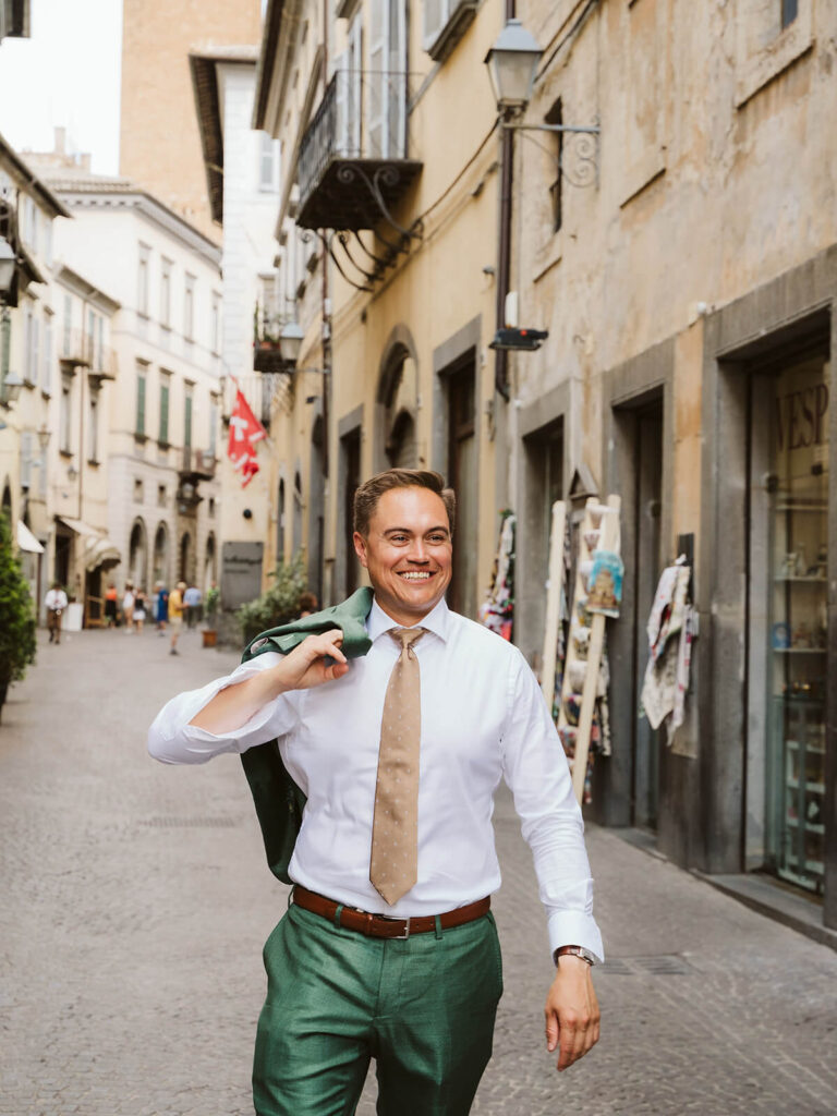 Meanwhile, not too far away, Alex was undergoing preparations of his own. He and his groomsmen gathered in the apartment of the church to ready themselves for the day ahead. They guys’ playful and silly antics kept the mood light, with plenty of laughter echoing through the apartment. Between buttoning jackets and straightening lapels, their excitement and joy were palpable as they strolled through the Orvieto streets before making their way to the vineyard for the ceremony.