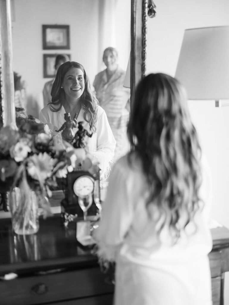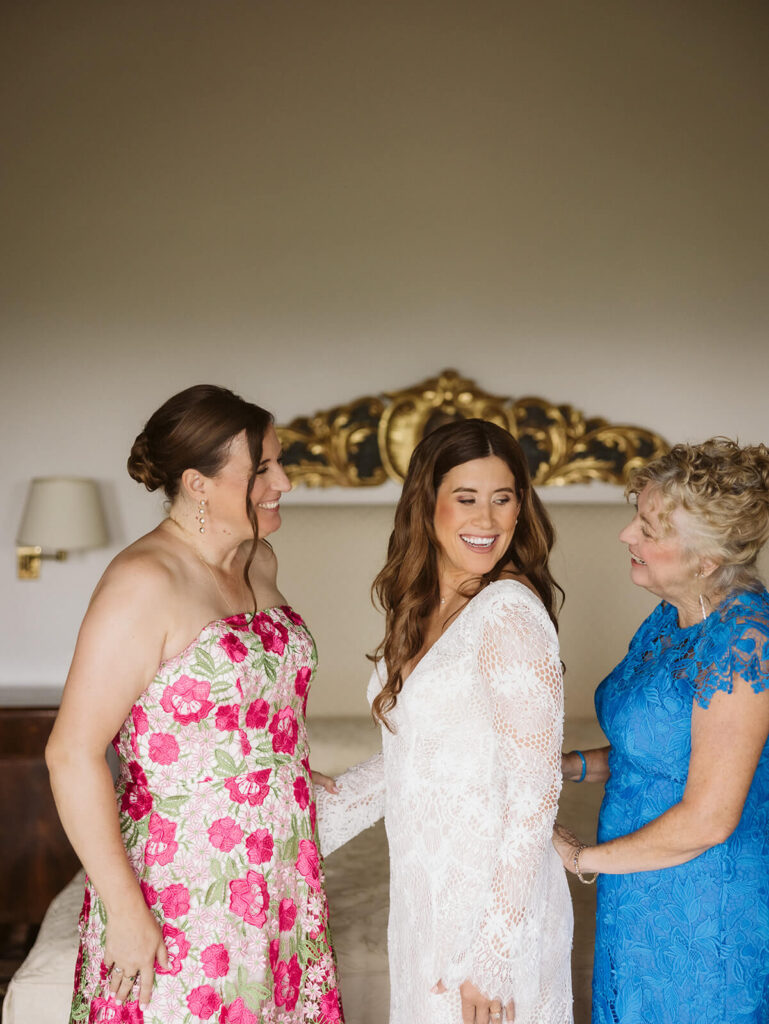 Following the welcome party, Gina and her bridesmaids spent the night at the Villa Barbi. The next morning, they woke bright and early to warm sunshine pouring through the large windows of the villa as they began preparations for the big day. The ladies enjoyed a morning of champagne, laughter, and cozy pink pajamas as they had their hair and makeup done. When Gina was ready, her mom and sister joined her in her suite to help her with the finishing touches of her wedding gown. The intricate floral lace gown was breathtaking, and having her mom and sister there to help her with it was a simple, sweet, and meaningful moment that made the morning even more special.