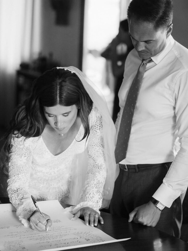 After the ceremony, guests made their way from the villa to the main hall of the Decugnano di Barbi for cocktail hour. Meanwhile, Gina + Alex took a moment to gather with their families and their wedding party inside the villa. Plenty of hugs went around as the newlyweds celebrated with their closest loved ones before signing an elegant keepsake wedding certificate to commemorate the day.