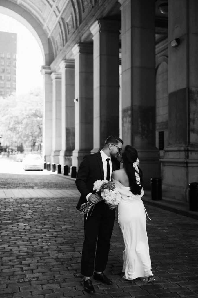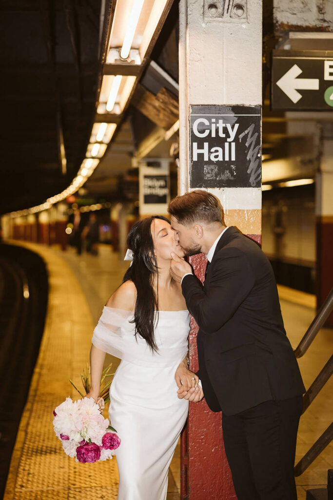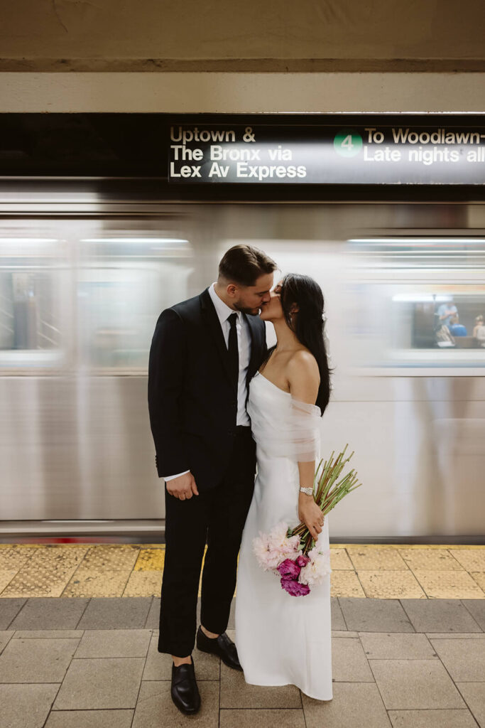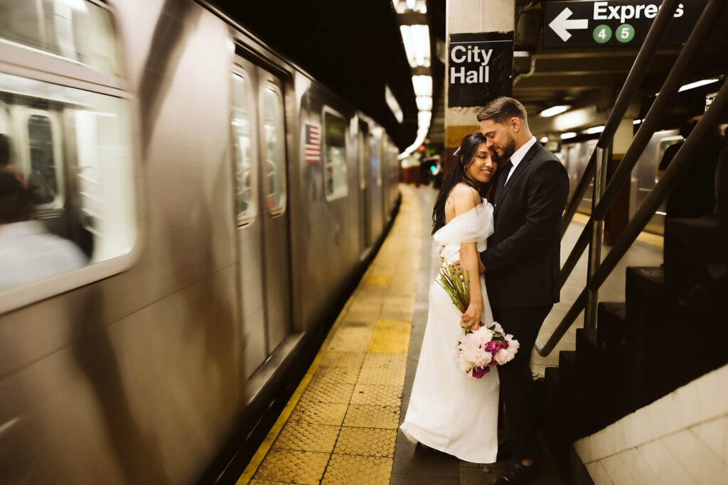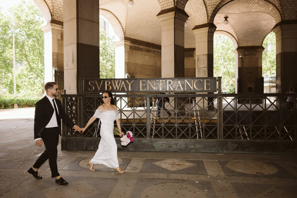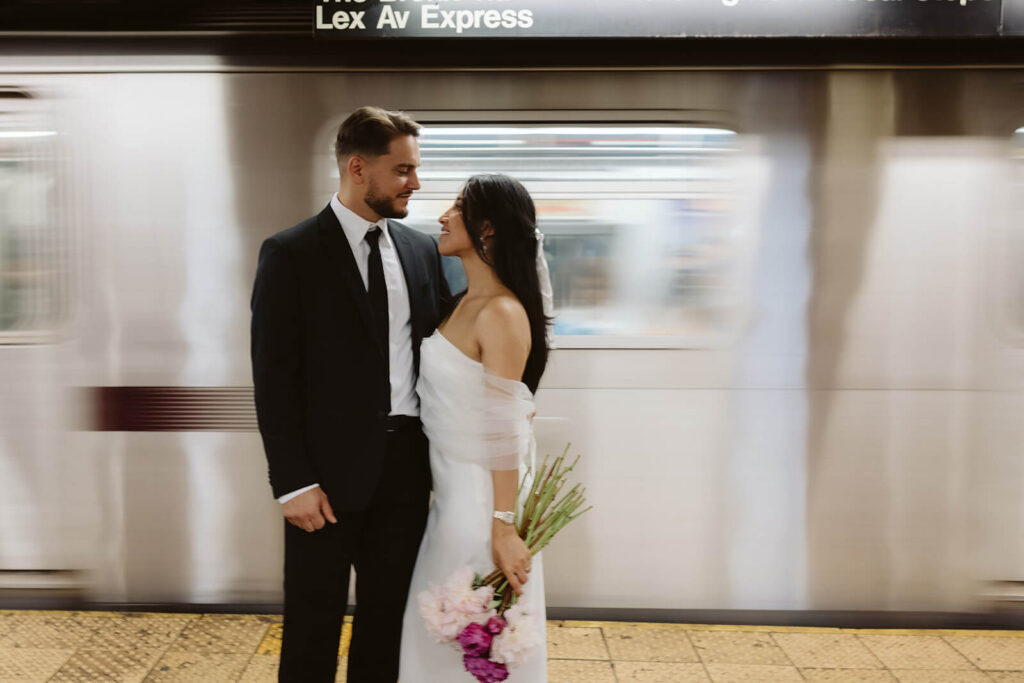 After leaving the courthouse, Carolina + Taylor spent the rest of their evening traversing Manhattan – the city their love story began in. Their first stop? The City Hall subway station. There we captured quintessentially New York City photos of the newlyweds with the whoosh of passing trains whizzing by in the background. Their dazzling smiles and laughter were just right for capturing both candid and posed shots that felt perfectly in sync with the vibrant rhythm of the city around them.