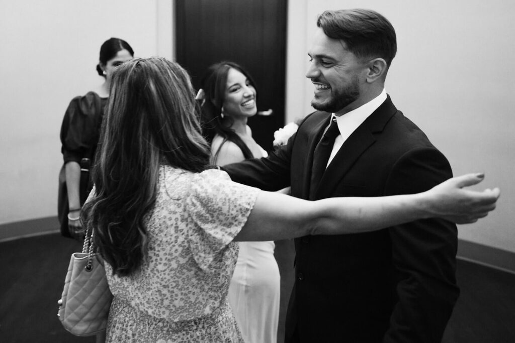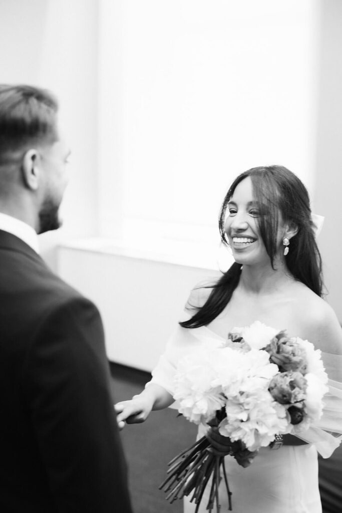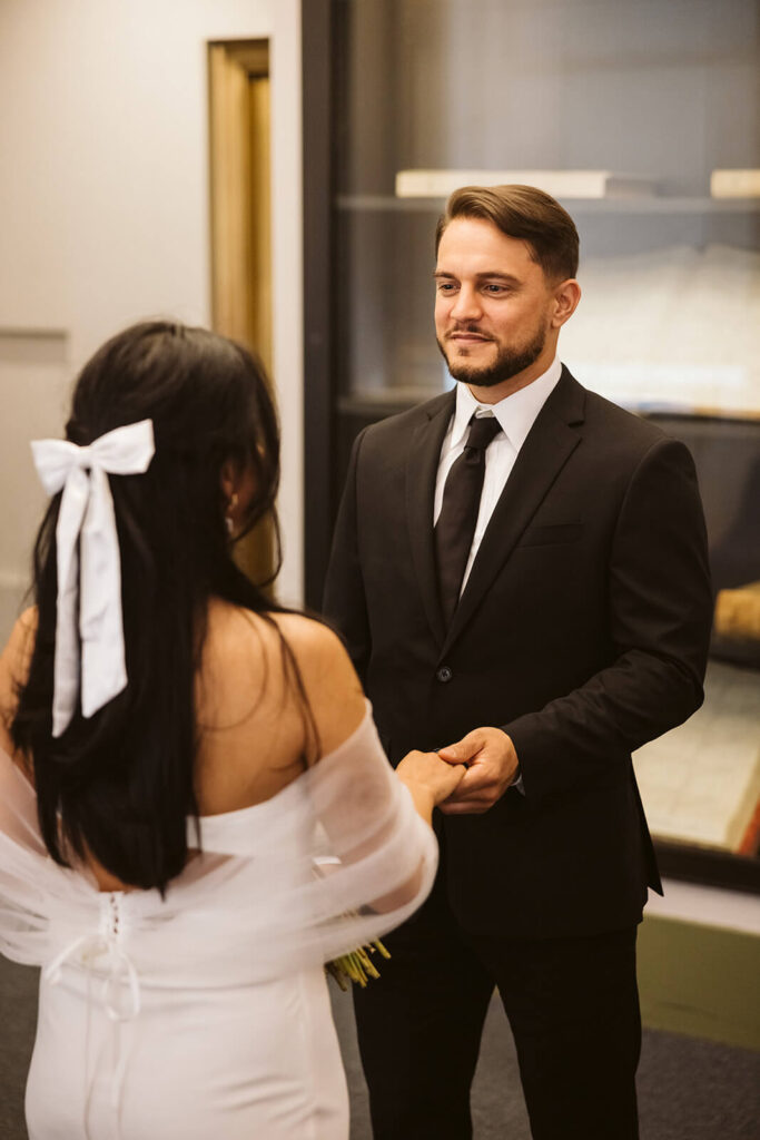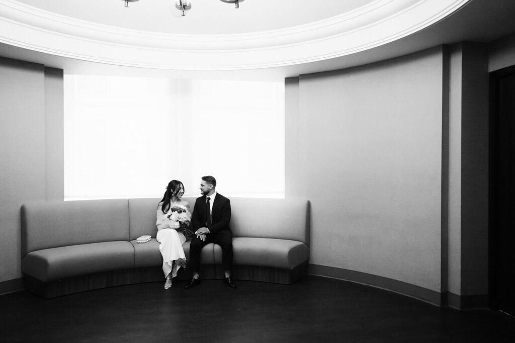 Carolina + Taylor arrived at City Hall dressed to the nines – Taylor in a dapper black suit and Carolina in an elegant white gown with a flowing ribbon to match running through her hair. They were joined by two loved ones to witness their special moment. After checking in and showing their IDs, they had a few quiet minutes to take it all in. Of course, we took that time to snap a few portraits. The two snuggled up on a bench in the waiting room which made for the sweetest candid shots of them as they waited for their turn.