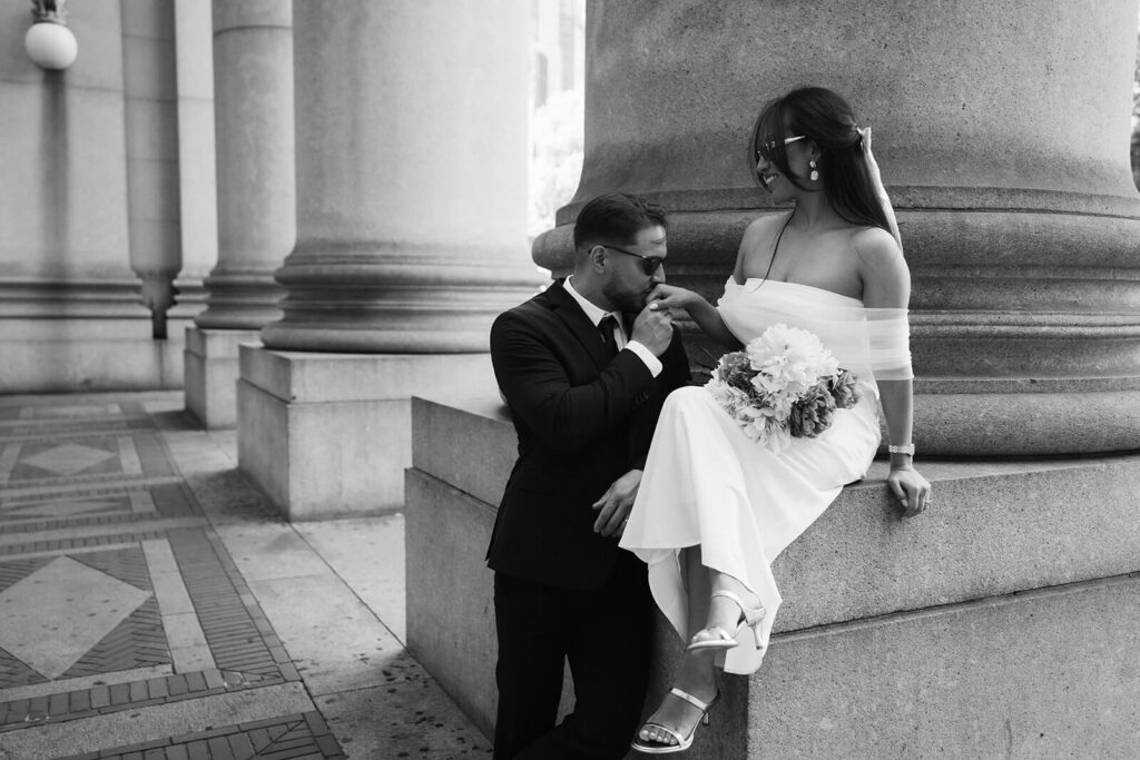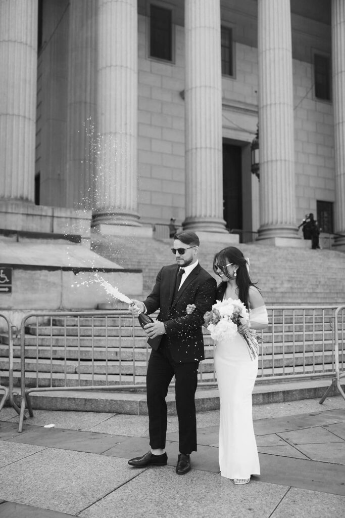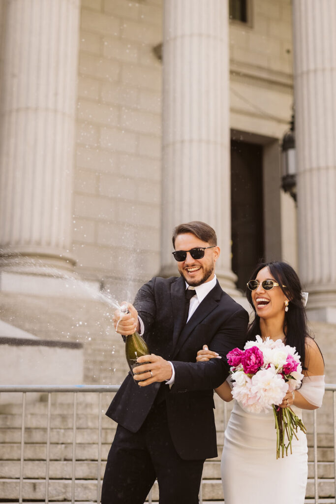Their ceremony itself was short and sweet, lasting less than ten minutes. A few heartfelt vows, a ring exchange, and their first kiss as newlyweds marked the start of their next chapter together. Afterward, we took a few group photos in the ceremony space then started to head out through the courthouse. As connoisseurs of unique architecture, we made sure to take newlywed portraits throughout the courthouse, pausing by exquisite marble walls and shining gold details. Then, we made our way outside where Carolina + Taylor wound their way through the Corinthian columns and intricate archways before pulling out a celebratory bottle of champagne. With pop and a bubbling, sparkling spray, the two celebrated their nuptials with a toast on the courthouse steps.