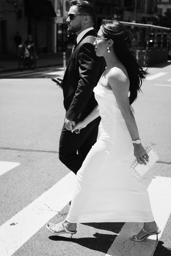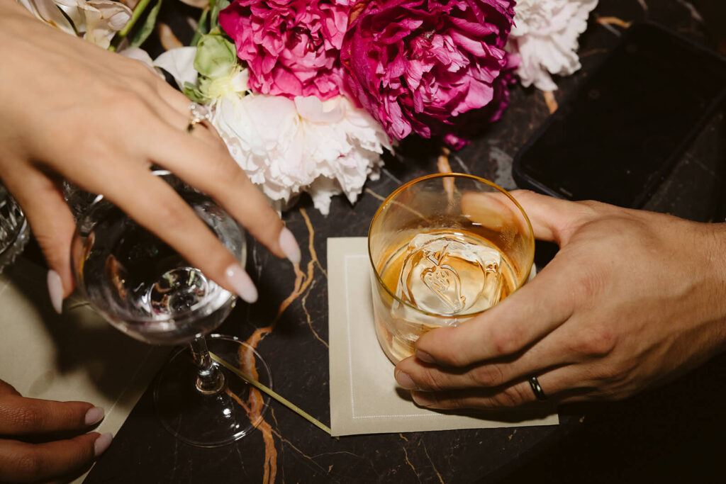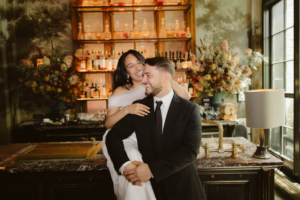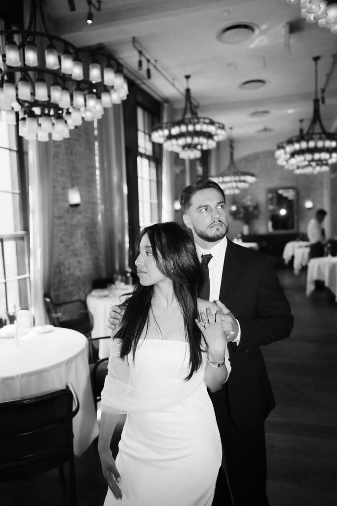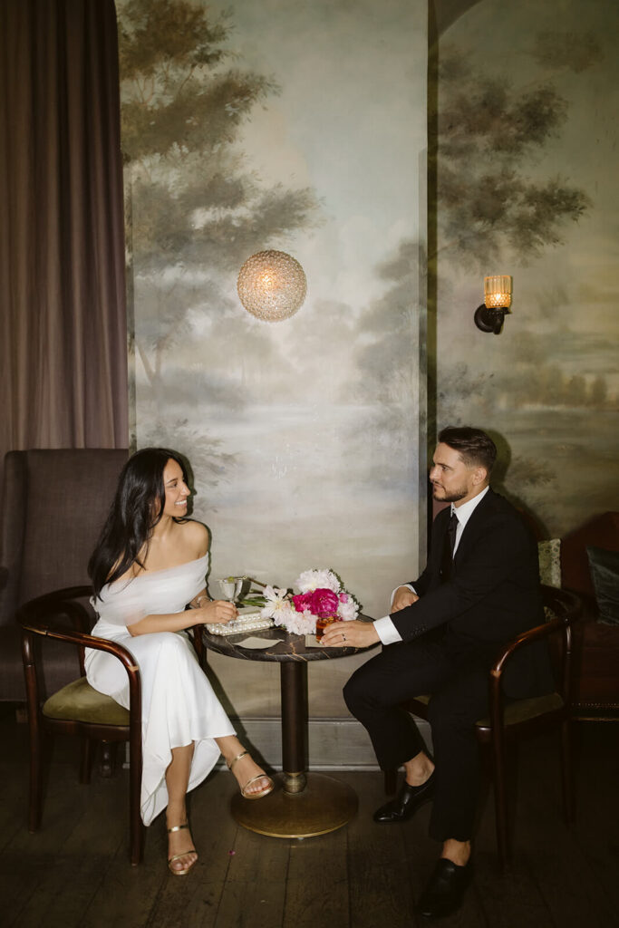From there, they hailed a classic yellow taxi. The driver even let us pause to take photos before taking the short drive to Le Coucou, a chic French restaurant just ten minutes away. This elegant restaurant was like a little slice of Paris in the Big Apple, perfect for this travel-loving pair. Surrounded by soft natural tones, warm lighting, and chandeliers dripping with glittering baubles, the two ordered drinks from the bar and toasted to their first evening as husband and wife.